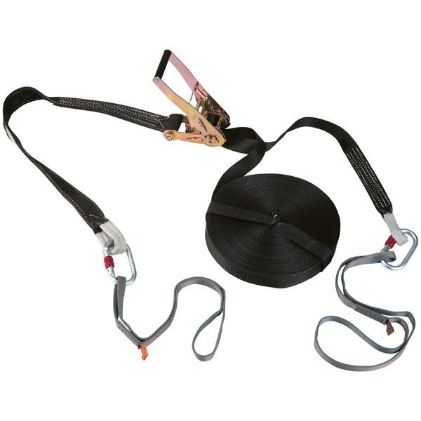 テンポラリーライフラインは、高所作業中に一時的に設置するためのポータブルでフレキシブルな水平アンカーです。最大2人まで使用できるように設計されています。落下係数が1以上の場合は、衝撃を6kN未満まで吸収するショックアブソーバー付落下防止装置を使用しなければなりません。ライブラインの引張強度は26.2kNです。スティール製のテンションラチェット、ポリアミド製アンカーループ2つ、スティール製ロッキングカラビナ2つがセットされています。