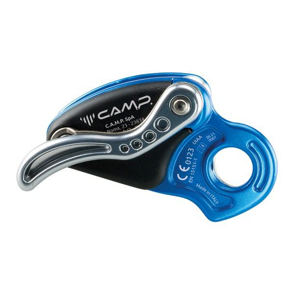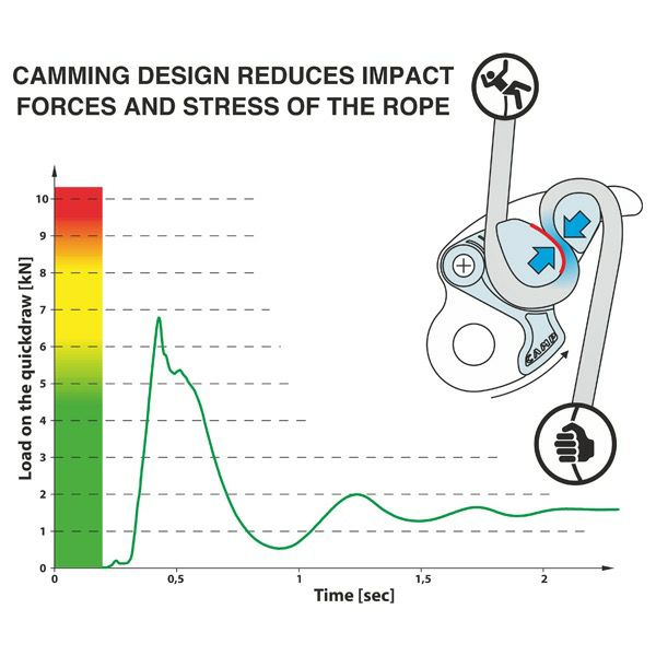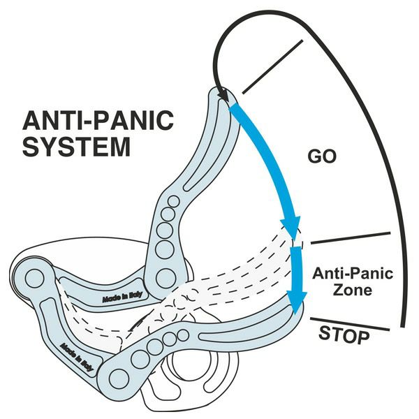 ブレーキアシスト機能付ビレイデバイス。独自のカム形状と構造によりロープへのダメージと、クライマーやビレイヤー、またプロテクションにかかる衝撃を軽減します。アンチパニックシステムの採用や、大ぶりなレバーなど安全性と操作性にも優れます。