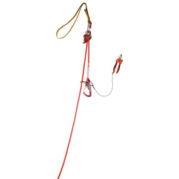 シンプルで効率的なレスキューキット。救助者は、要救助者をロープに取り付け、要救助者のランヤードを切断してから、ドルイドディセンダーを使用して地面にローワーダウンさせます。また小さなカラビナにロープを通すことで作成できる倍力システムを使用して、要救助者を持ち上げ、ランヤードを取り外してから地面に下ろすことも可能です。屋根での救助にも適しています。すべてのコンポーネントはCE認定のPPEです。