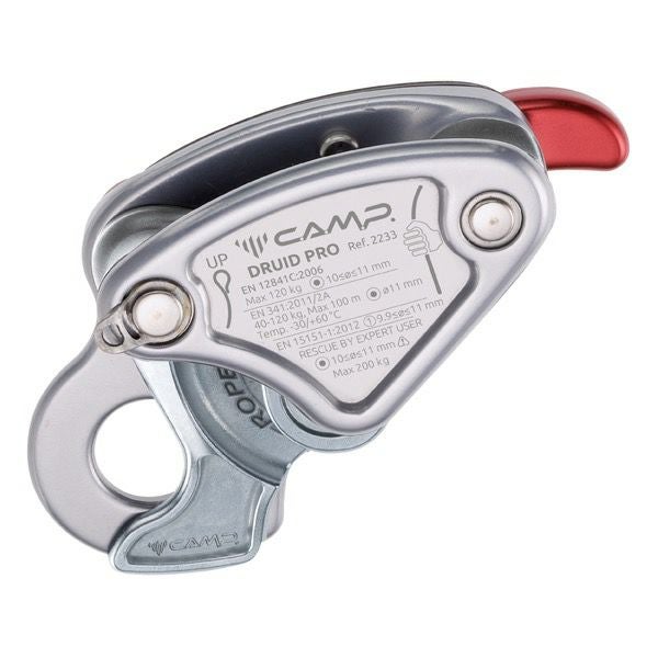 セミスタティックロープ10-11mm用に設計されています。レバーにはアンチパニック機能が付いていません。本体とレバーは丈夫な熱鍛造アルミニウム合金製です。機械部品は精密鋳造ステンレス鋼で作られています。内部機構とロッキングカムは特許取得済みの設計を採用。非常に滑らかに作動するロッキングカムは特許取得済でロープのわずかなスリップにより、ショックエネルギーを吸収し、ロープの摩耗や劣化を最小限に抑えます。ロープに対しなめらかに作動するので、ロープ登高が容易です。荷重がかかっていない状態や限定的な荷重状態の場合、トリガーによってカムを非アクティブにし、ロープをすばやくスライドさせることができます。落下防止のキーパーコードを取り付けるスチールリング付。9.9から11mmのダイナミックロープを使用することで登山用のビレイ器具として使用可能。ディセンダーとして通常使用は120kgまで、レスキュー時最大200kgまで。