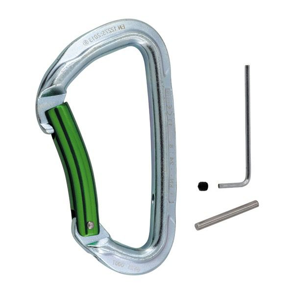 人工壁で使用するために設計されたスチールボディカラビナ。ボルト固定式ピンがカラビナを適切な向きに維持します(六角レンチ付属)。