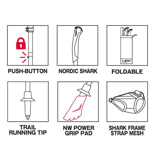 収納サイズ約35cmのコンパクト性とメッシュスタッフサックによる携行性に優れた、フルカーボンシャフト仕様の三段折りたたみ式ノルディックウォーキングポールです。プッシュボタンシステムにより連結シャフト固定が簡単に行えます。もっともシンプルなデザインにすることで、最軽量化を実現。グリップ部分は操作性に優れ、コルクシートが広く握りやすくなった【ノルディックシャーク・グリップ】仕様。ストラップは通気性に優れる、シャークフレームストラップメッシュを採用しました。