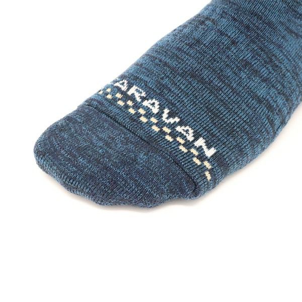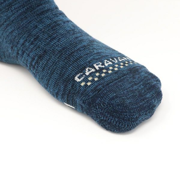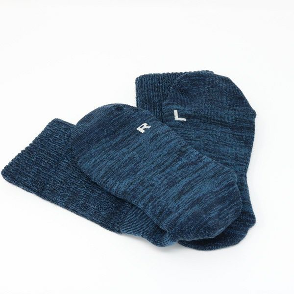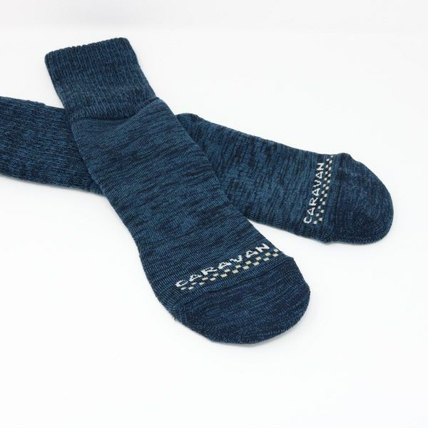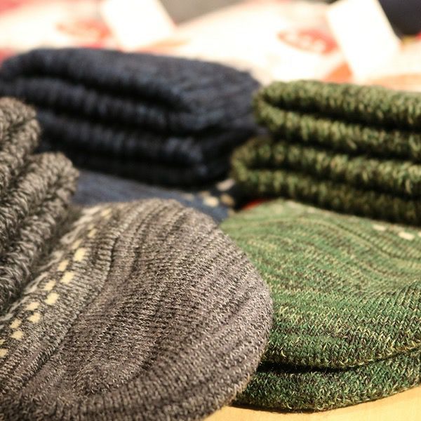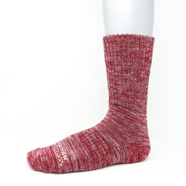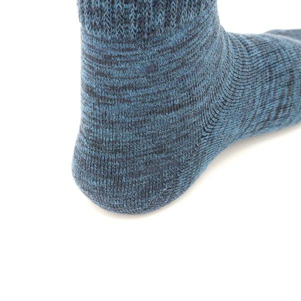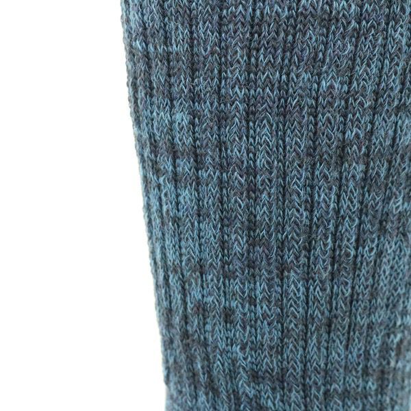 メリノウールのソフトな肌触りを活かし、締め付け感のない柔らかな履き心地に仕立てました。足首から履き口まではざっくりしたリブ編みにし、ふんわりと包み込むように優しくフィット。濃淡のある杢調の編み地は、ちょっとレトロな雰囲気を醸し出しています。擦れやすいかかと部分は、表面にナイロン糸を集中させて耐摩耗性をアップ。ハードなトレッキングもしっかりサポートする中厚ソックスです。