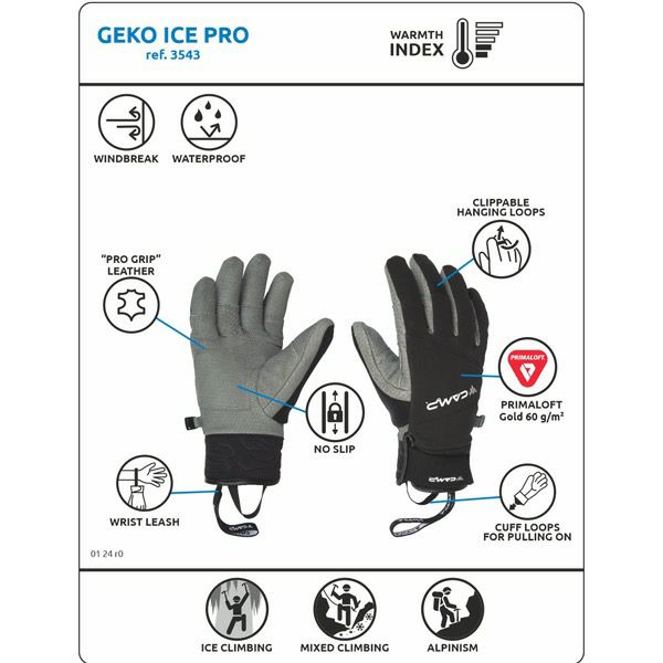 本体にPrimaLoft_Gold 60g/m2インサレーションを使用した、保温性の高いアイスクライミング向けのグローブです。手のひらの素材をプログリップレザーへと変更してコントロール精度と感度をアップデート、指の形状をシェイプさせて優れた操作性と快適性を実現しました。