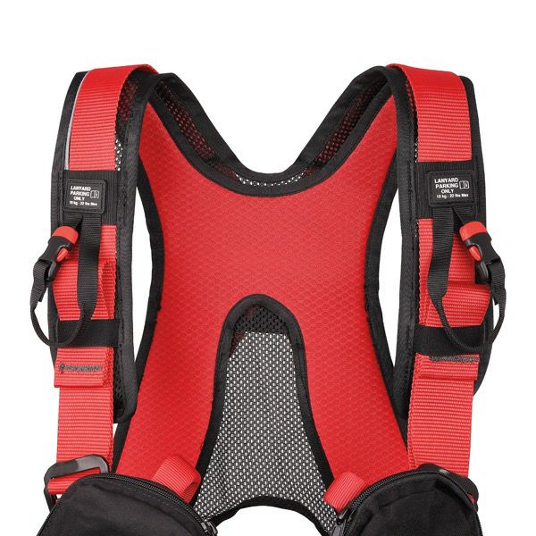 フォールアレスト用の 2 つのアタッチメントポイント: 胸部のダブルテキスタイル ループ1点、背部のスチール製リング1つ。2つのギアループ。