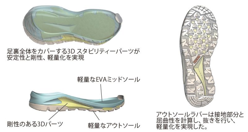 - 着地時の衝撃吸収素材には硬度の違う2つのEVAを組み合わせました。これにより、優れたクッション性とバランス性を両立しています。