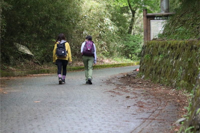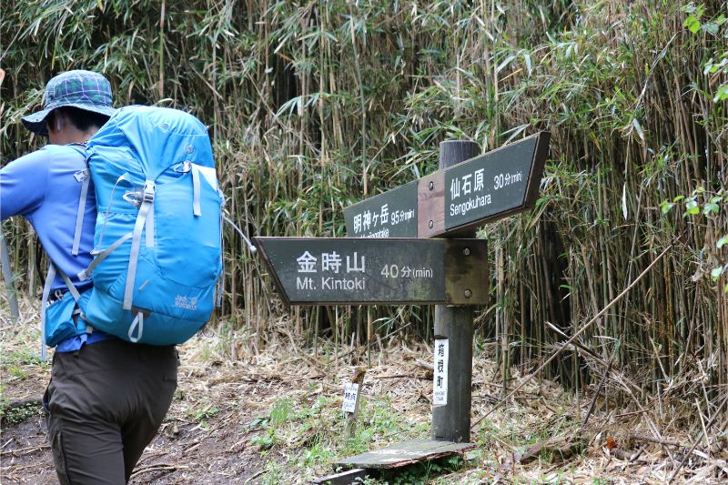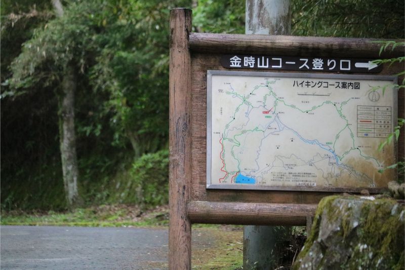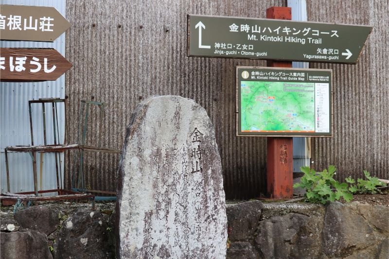 まずはバス停沿いにある案内図でルートを再確認。ここから登山道入口までは舗装路を歩いて行きます。直線的に伸びる道を登っていくと登山道の標識が現れるので、そこからいよいよ金時山登山のはじまりです。