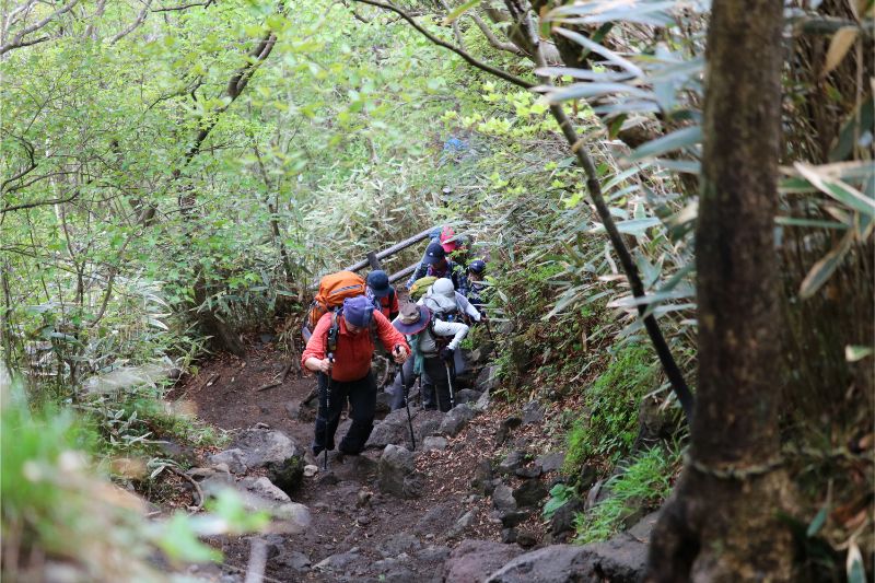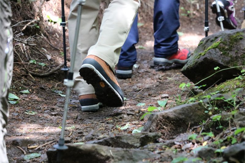 登山道は整備されているとはいえ普段の舗装路とは違いますので、やっぱり登山をするときは【登山靴】を履いて登りましょう。時々、登山靴に似た靴で参加されるお客様もいらっしゃいますが必ず後半になると苦労してますよ。足が疲れてしまってスリップ尻もちついたり、疲労困憊でトレッキングポール頼りになったり。共通するのはソールやアッパーが柔らか過ぎて、靴が足をサポートできていないため、自分の足で踏ん張り続け疲弊してしまうパターン。
