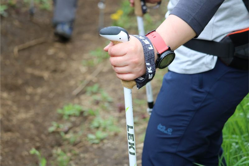 輪っかの大きさもLEKIトレッキングポールは簡単に調整できるので、個人の手の大きさに合わせて調整します。(写真のように少し輪っかにゆとりがあるくらい)