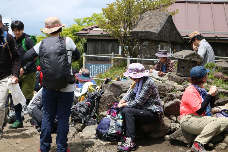 標高1.212Mの金時山山頂は、多くの日帰り登山客で腰を下ろす場所を探すのも一苦労なほど盛況でした。2つある茶屋も昼時は大賑わいで、外に持ち出して食事している人も大勢いました。確かに天気が良ければ外での食事の方が気持ちイイですしね。みなさん、楽しげに山頂での時間を過ごしていましたよ。ここでキャラバンツアーの皆さんも昼食タイムです。