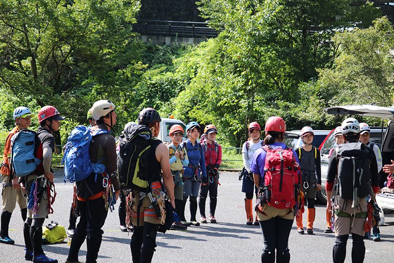 本番当日、装備一式を身につけて挨拶集合。毎回お世話になっている【オリソンテ登山学校】の講師の方から状況説明をおこない、入渓ポイントまで移動します。さあ、沢登り体験会の始まりです!!