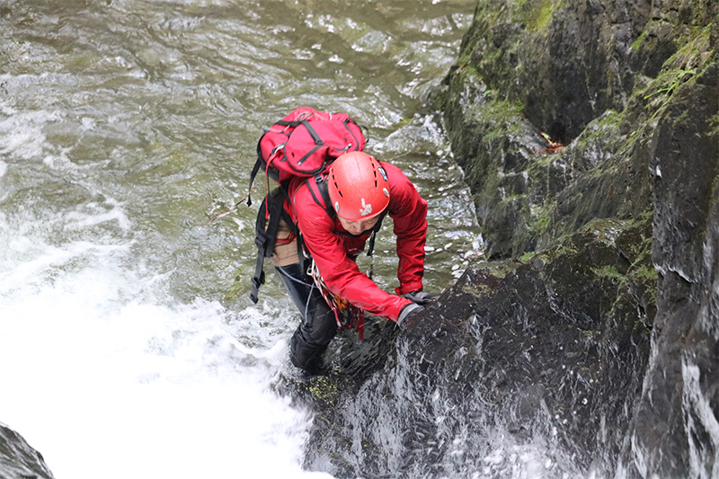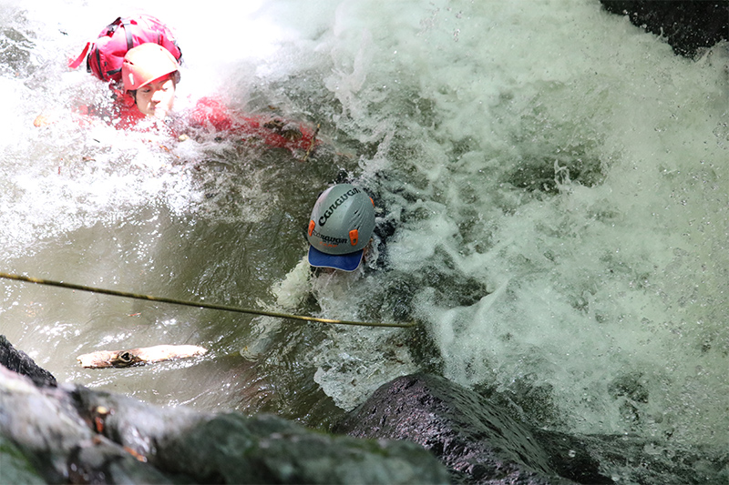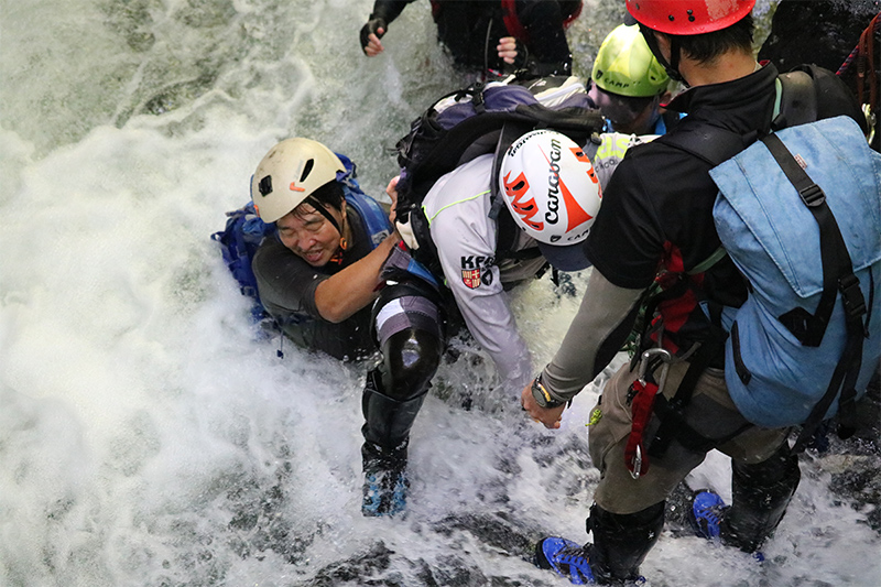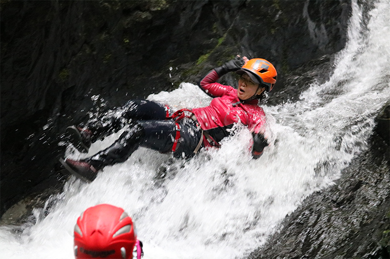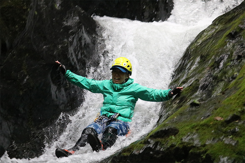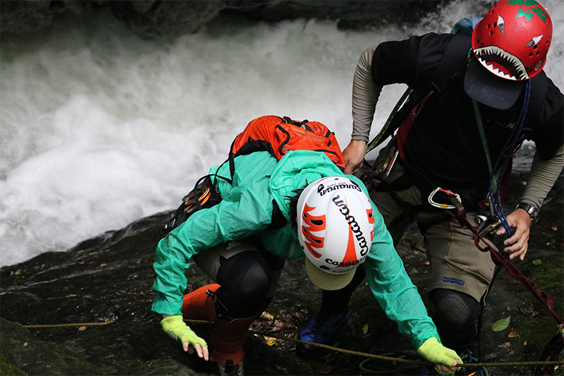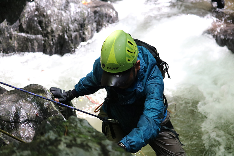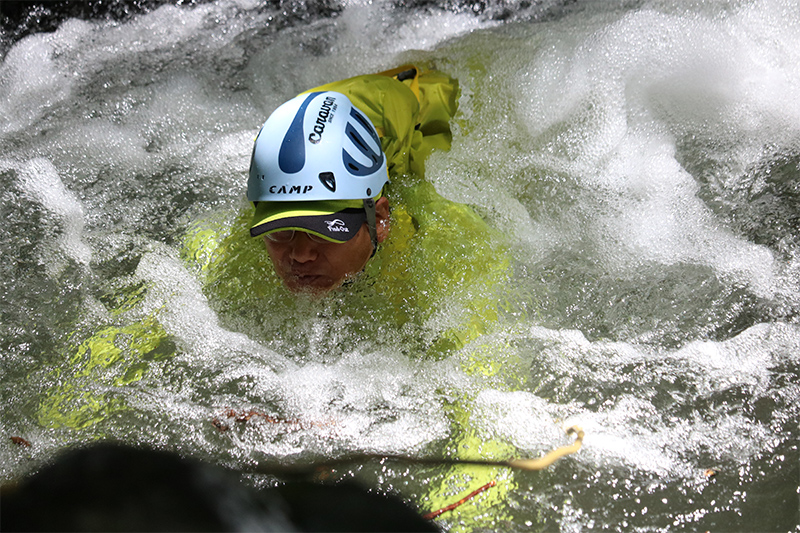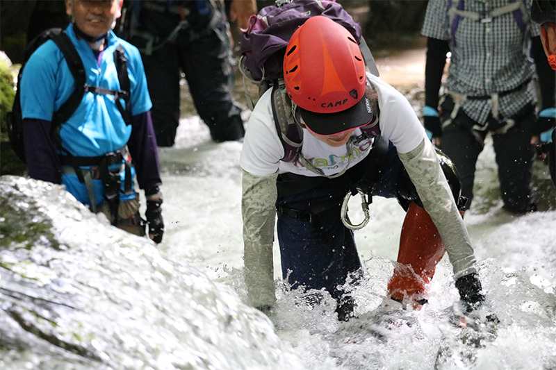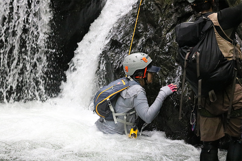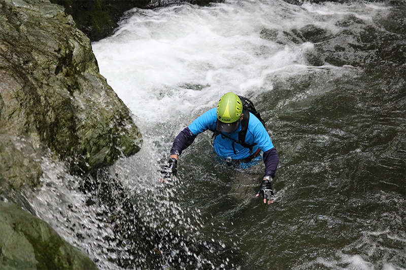 頭上から降りかかる水しぶき、まさに全身ずぶ濡れ状態になるのが沢登りの醍醐味です。