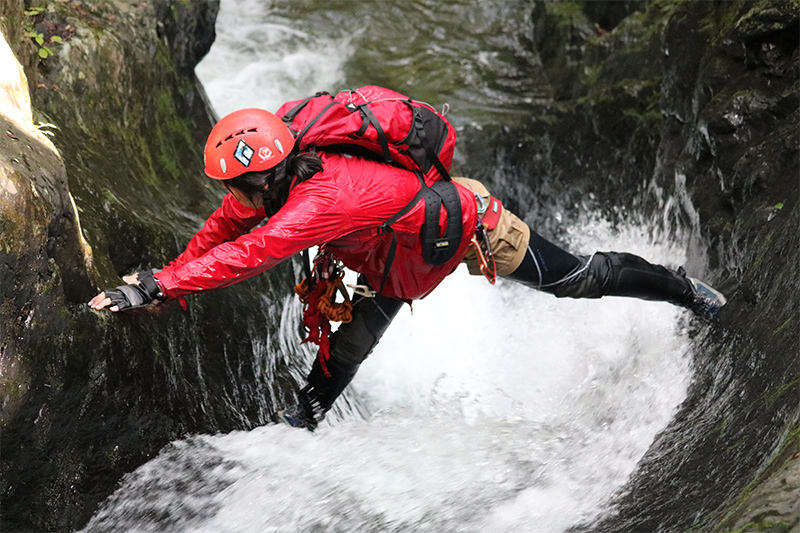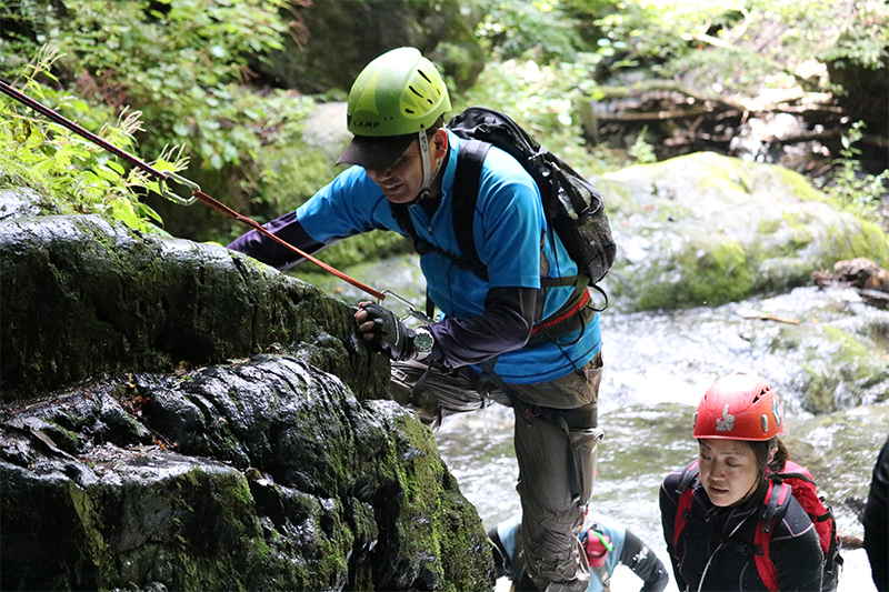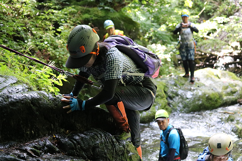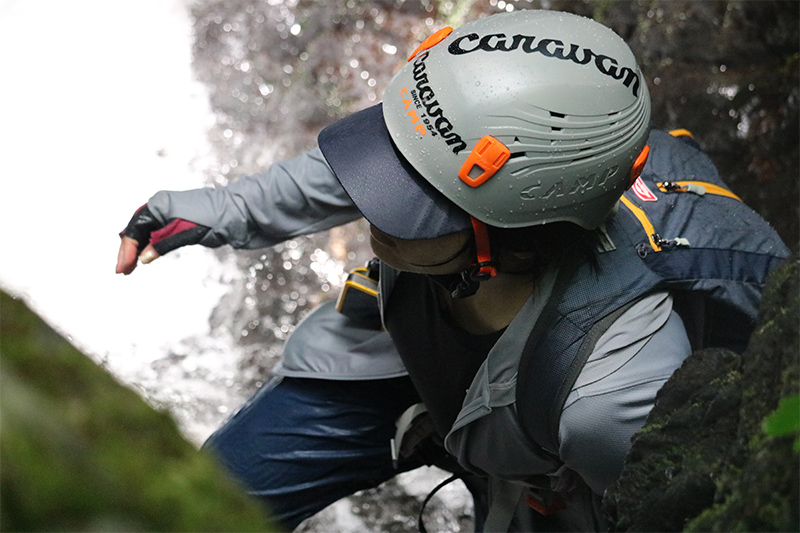 その1つが、日本生まれのアクティブ・クライミングスタイルを楽しめる『キャラバン沢登り体験会』です。沢登りは夏でも涼しく、釜や滝、ナメなど変化に富み、登っていて飽きることがありません。キャラバンでは夏の暑い時期限定で初心者/初級者を対象に、沢登りの魅力を伝えるための体験会を開催しています。