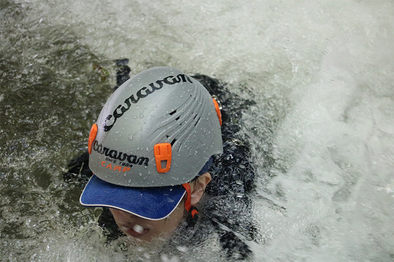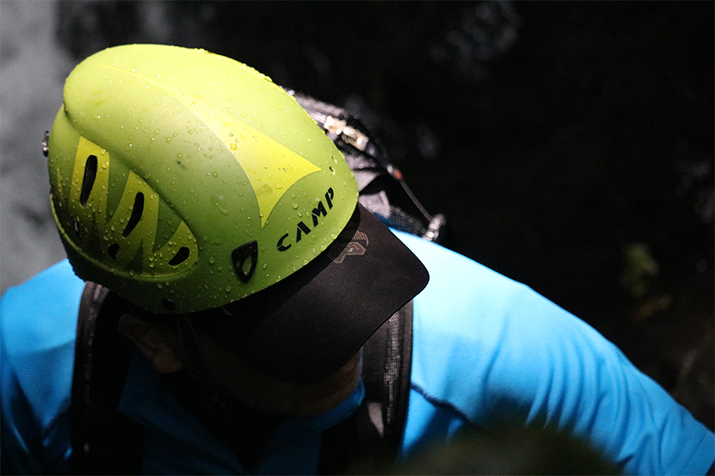 キャラバンではツバ有り帽子にヘルメットの組合せを推奨しています。ヘルメットから滴り落ちる水滴で視界を妨げられないよう、ツバで視界を確保する方法。