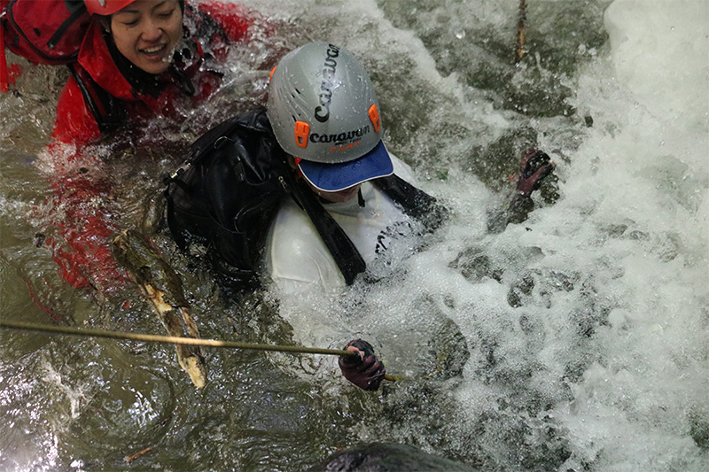 あっ!! 危ないっ、このままでは溺れる危険あり!! 岩壁に取り付くのに苦戦した彼女、複雑な流れに身体が沈みかけ、このままでは溺れかねないっ!! 一瞬、場に緊張が走ります。その瞬間です。すかさず女性スタッフがサポートに入ります。見事な判断でした。