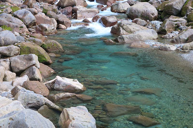 この雪解け水の色をご覧ください。エメラルドグリーンの清流は触るまでもなく、キンキンの冷たさが伝わってくると思いませんか。実際に目で見た時はあまりの美しさに感動しました。
