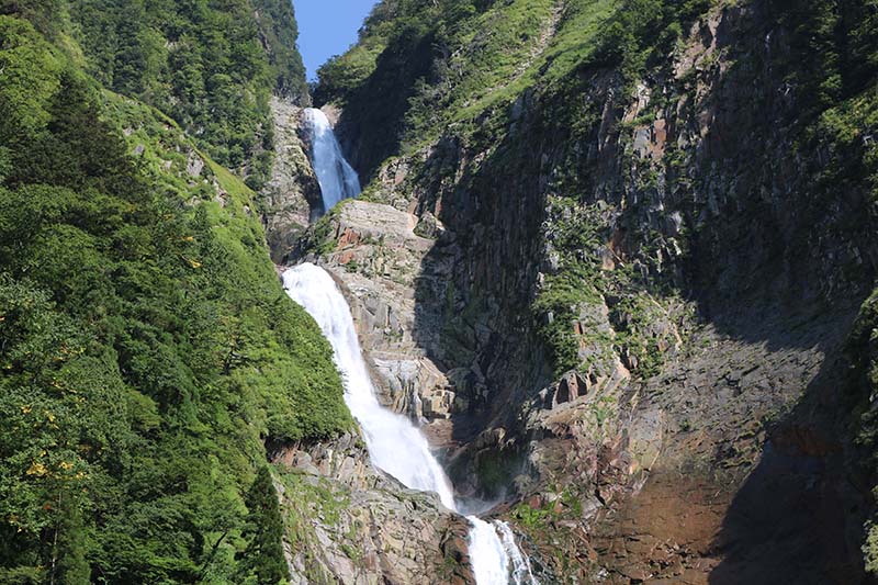 4段構成の見応えのある『称名滝』は総全長350mほどもある迫力満点の滝で、滝壺の直径は約60mもあるそうです。