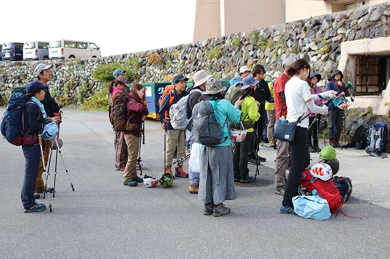 まだ立山は山岳ヘルメットの装着義務化はされていませんが、登山道の状況を考慮すると当然ヘルメット装着が望ましい山域です。今回は安全対策、啓蒙活動の一環として全員にCAMPヘルメットの装着をお願いしました。
