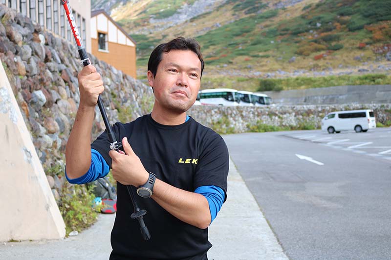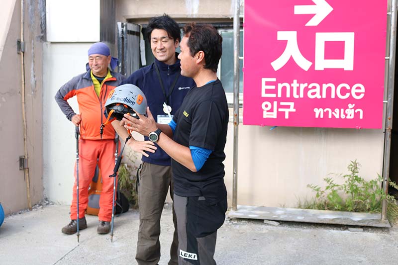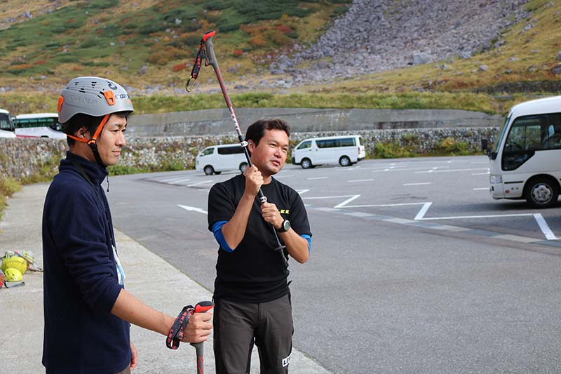 ここで明日使用するLEKIトレッキングポールとCAMPヘルメットを手渡します。