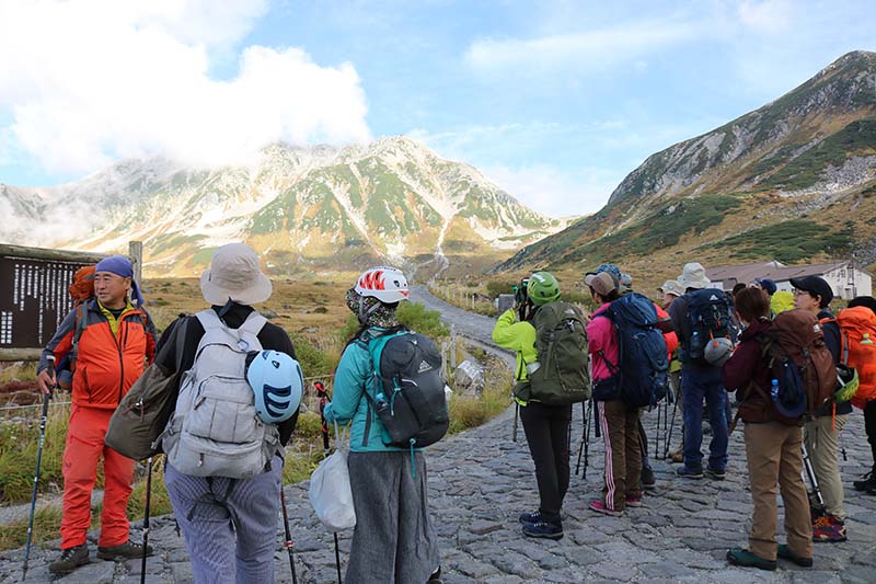 雷鳥荘へ向かう道中で皆さんが立ち止まって写真を撮っています。