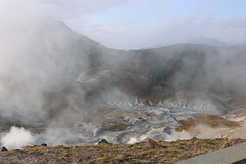 ここが有名な『地獄谷』です。以前はもっと近くで見ることが出来ましたが2011年から噴気活動が活発化し、有毒ガスも発生していることから立ち入りが禁止されています。この位置からでも独特の硫黄臭がしており、個人差はありますが体調異変を感じることもあるので臭いに敏感な人はとくにご注意ください。