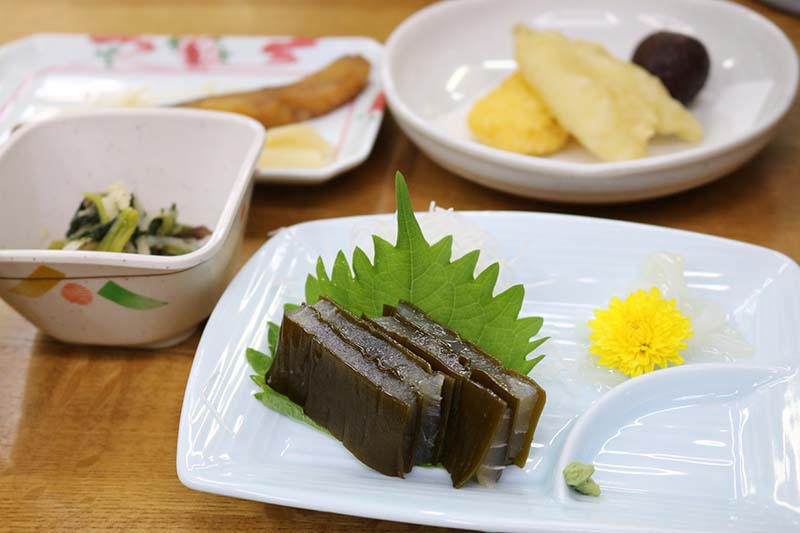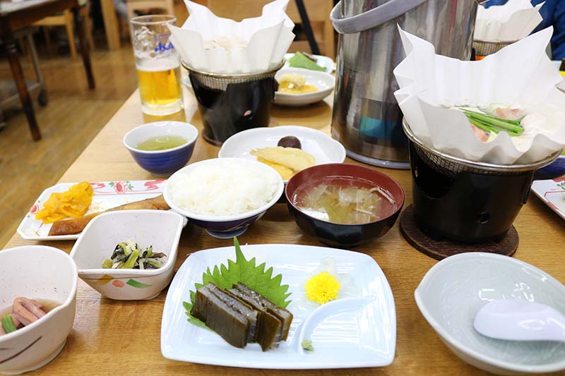 本日の夕食は、豚鍋・昆布締めのお刺身・てんぷら・魚の煮つけ・酢の物・おひたしなど、何ともボリューミーな夕食でした。ご飯・みそ汁・お漬物類はおかわり自由です。外ではお酒を基本飲まない僕は、思わず食べ過ぎなほど食べてしまいました。