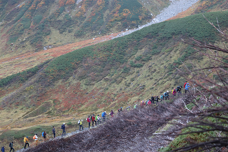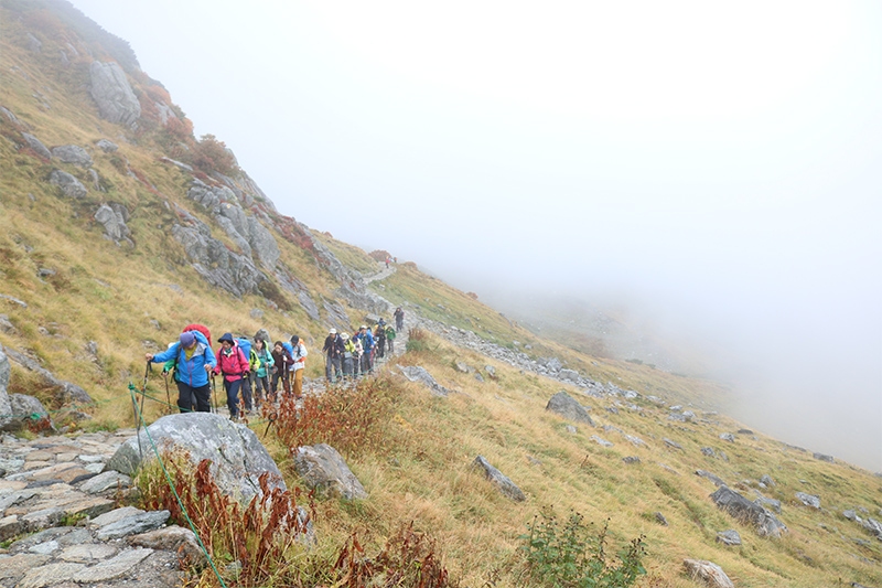 まずは室堂経由で一の越を目指します。参加者+スタッフで総勢24名の団体行動は隊列が間延びしやすいため、スタッフ間同士はトランシーバーで状況伝達をおこないます。とくに前や後ろから他の登山者が接近してきた場合は、対処可能な場所で道を譲るなどの配慮が団体ツアーの場合とても重要となります。グループ山行の時も同様ですが周りへの気配りを心掛ける、それを参加者の皆さんに伝えるのも“キャラバンツアー登山教室”の役目だと思っています。