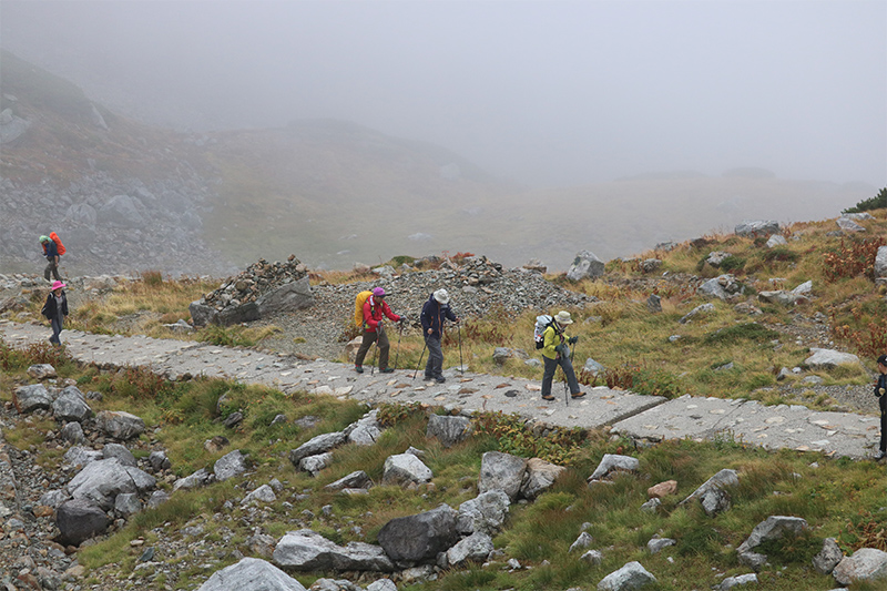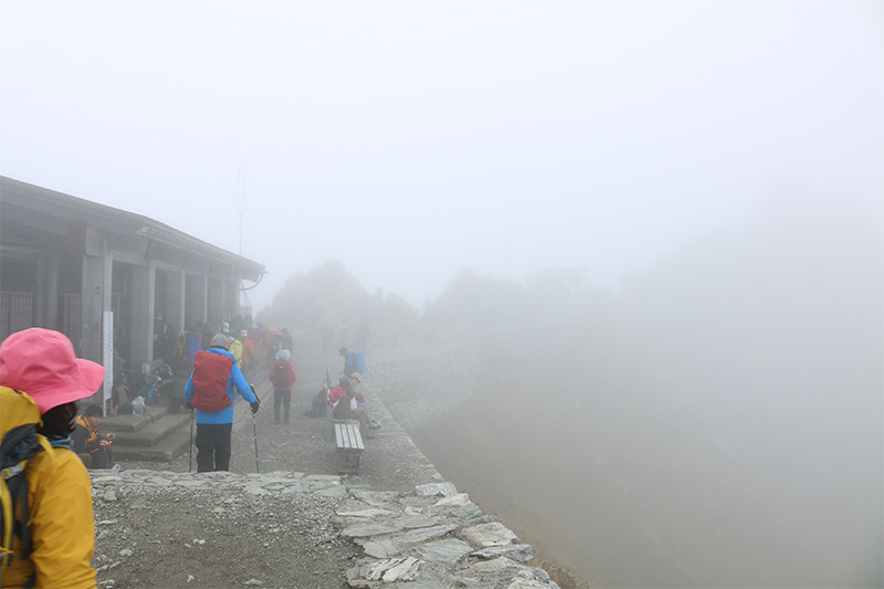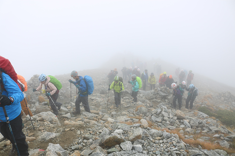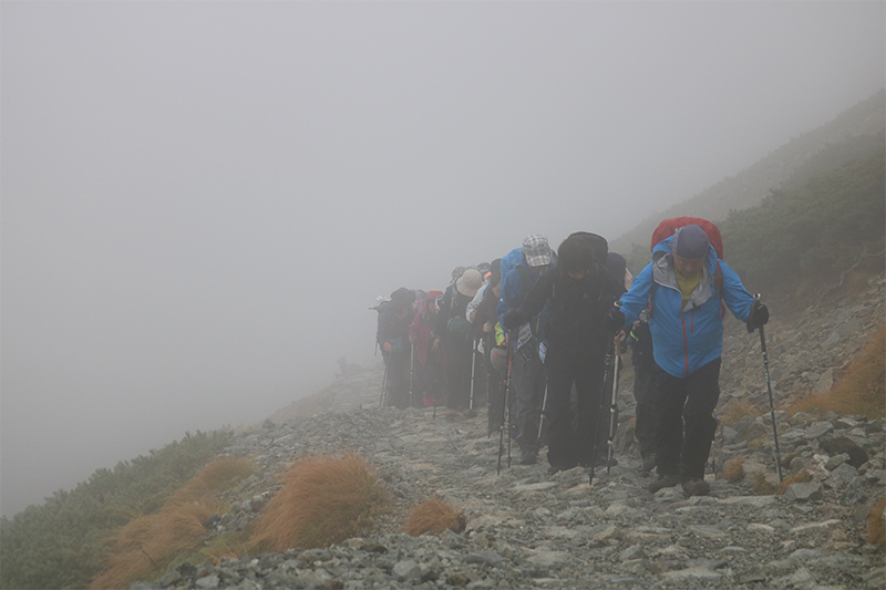 雲の切れ間では300m先くらいまで見渡せるのですが、すぐに視界が奪われて灰色の景色一色になりました。この繰り返しの中、時折見ることのできる景色に皆さん喜んでいました。