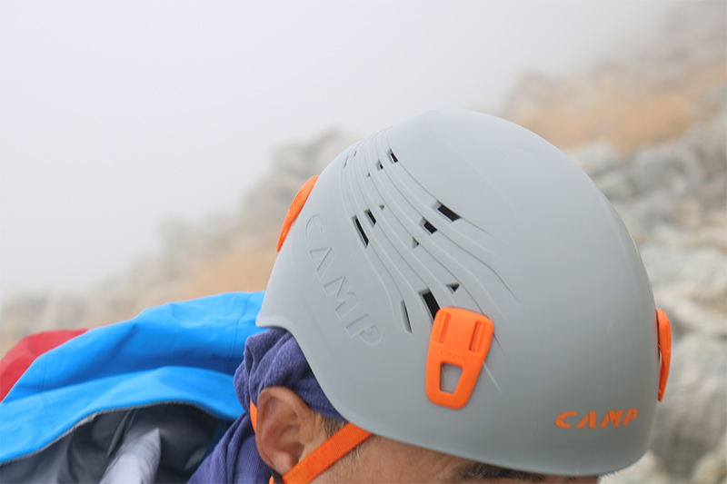 こちらのヘルメットは左側のグレー色が『CAMP_タイタン』、右側のイエロー色が『CAMP_ストーム』。デザインもさることながらヘルメット自体の素材も異なり、総重量も違います。もちろん被り心地も違うので、履き比べならぬ被り比べをお薦めします。