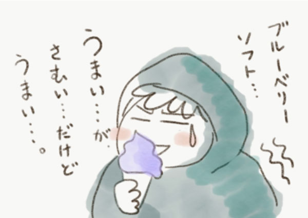 雨に濡れて寒かったのですが、ブルーベリー味のソフトはとっても甘くて、疲れたカラダとココロに沁みました。一言で言うなら…寒美味しかったです…。