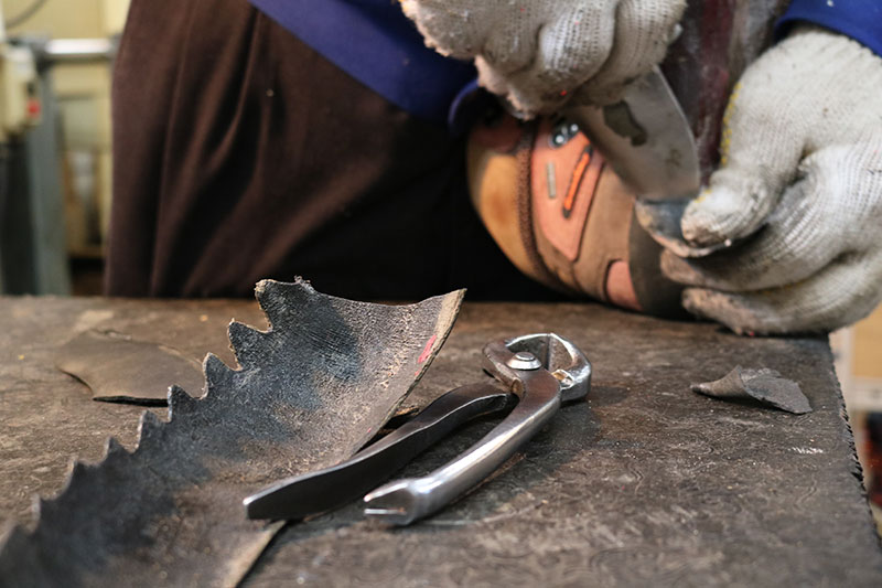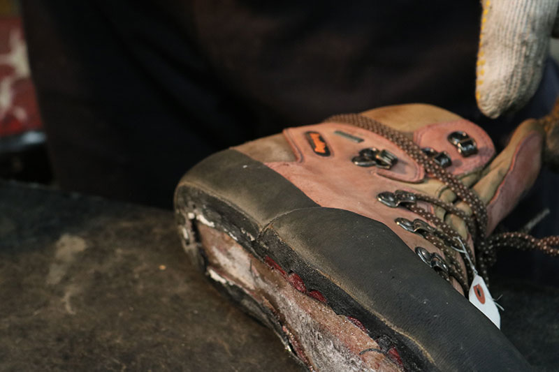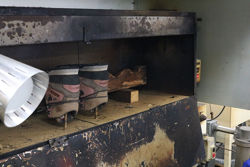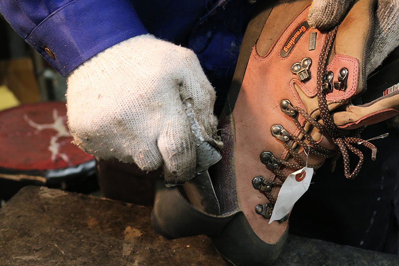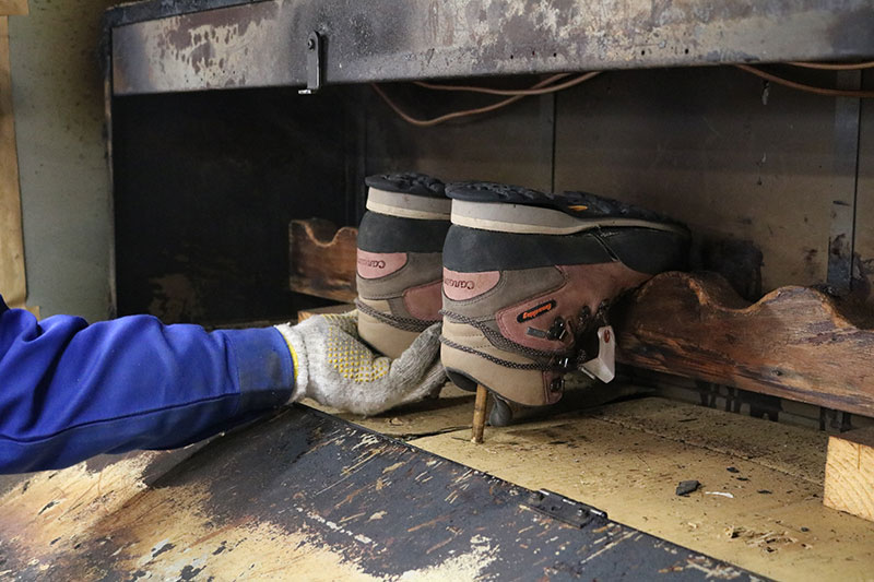 気になって作業中の職人さんに聞いてみたところ、『もう何十年もこの仕事をしていると素手の感覚で押し付け具合を見極めているので、いまさら手袋なんてしたら誤って登山靴を削ってしまうよ』。そう笑いながら答えてくれました。