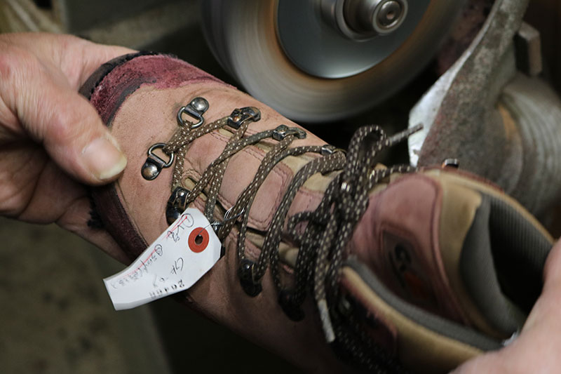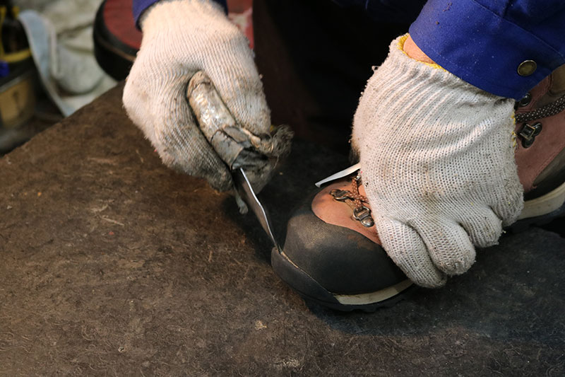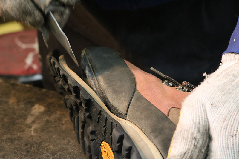 この工程ですが、以前私はサンプルの登山靴で削る作業体験をしたことがあります。強く押し当ててしまうと、アッパーまで削れてしまい靴をダメにしてしまう。慎重に触れるくらいの力加減でそっと行えば出来なくはないものの、1足終わるまでに時間が掛かり過ぎて作業が滞ってしまう。何とも難しい作業だったのを覚えています。