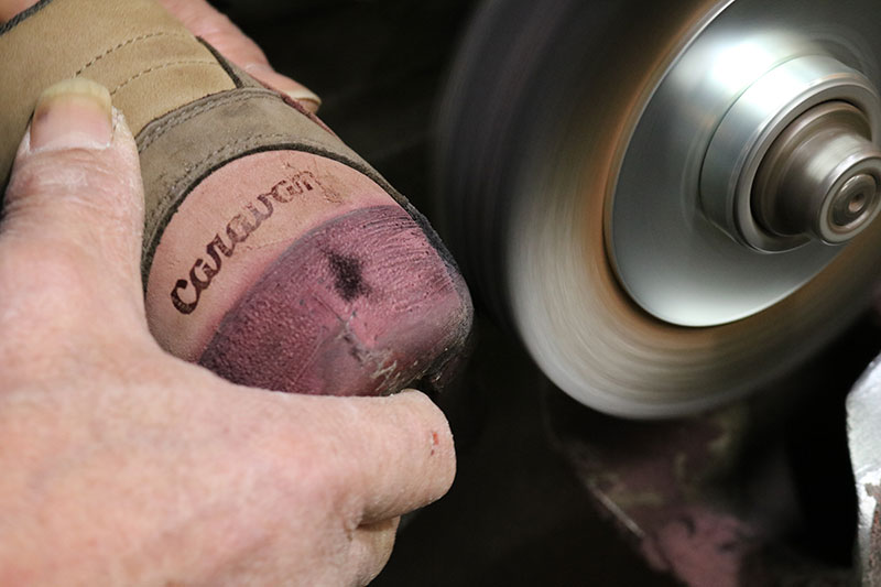 続いてアッパーに付着している接着剤部分にバフィング加工を施し、再接着しやすい状態にします。微妙な触れ加減で薄く表面だけを削っていきます。