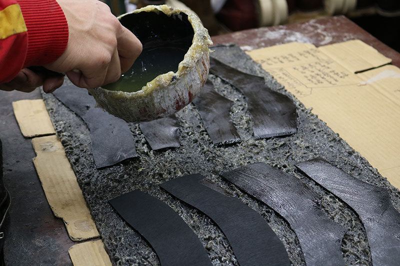 例えばラウンドラバーに接着剤を塗り、接着剤の接着力を高めるための作業をしている工程が別の場所でおこなわれていました。