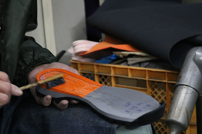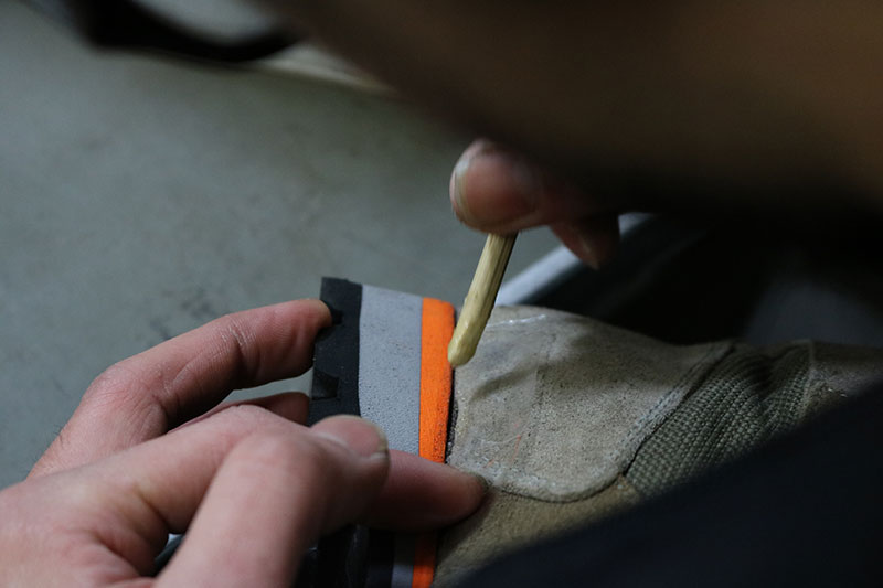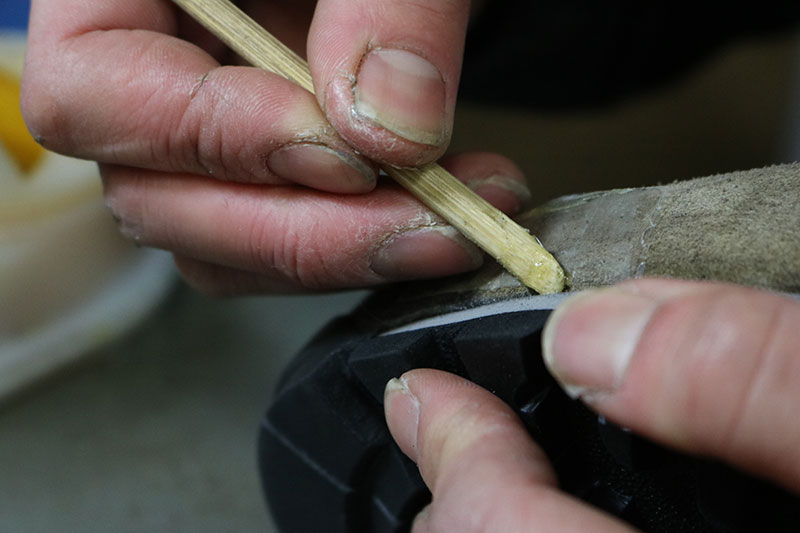 ミッドソールとアッパーの接着部分を目視で確認しながら、接着剤で均一に隙間を埋めていきます。接着面のアッパー側面は湾曲しているため、フチまでピッタリとは接着されません。隙間が開いているように見えていても、接着はしっかりおこなわれています。