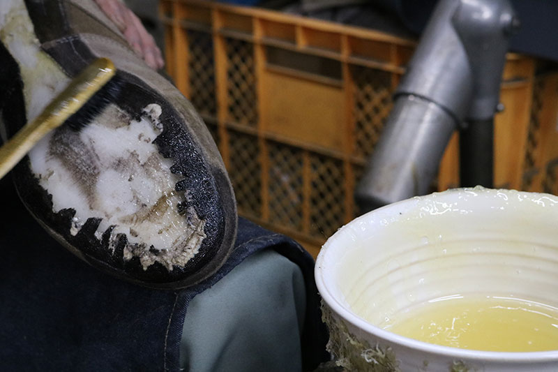 アッパーの足裏底に塗布するのは別の容器に入った接着剤を使用しているそうです。