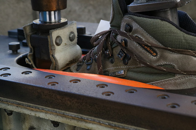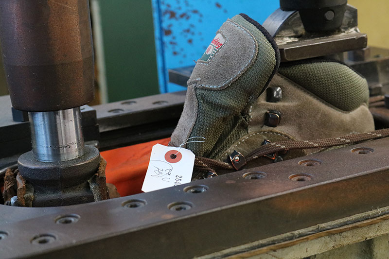 まずは手でソールを貼り合わせます。その次に圧着機を使って圧力を加えていきます。