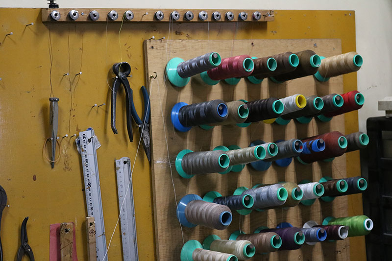 また、シューズ・リペアルームにはソール張り替えの作業ラインの他に、縫製部分などの糸ほつれ修理をするための補修材料や機材が多数あります。