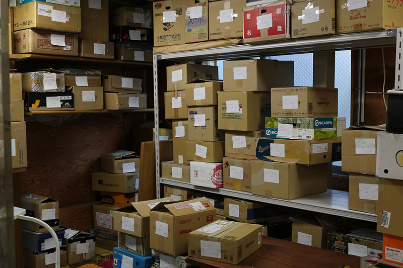 修理依頼で送られてくる箱は、実に大小さまざまな箱に入って送られてきます。間違いが発生しないように1つずつに管理No.を貼り付け、修理の間、大切に保管しています。