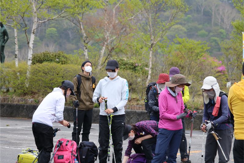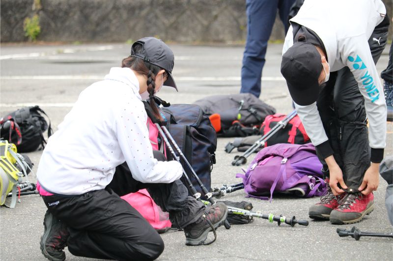 登山教室でおなじみの山岳ガイド講師(日本山岳ガイド協会理事長:武川俊二氏)から、LEKIトレッキングポールの有効的な使い方、登山靴のフィッティング確認などの指示があり皆さん説明に耳を傾けていました。