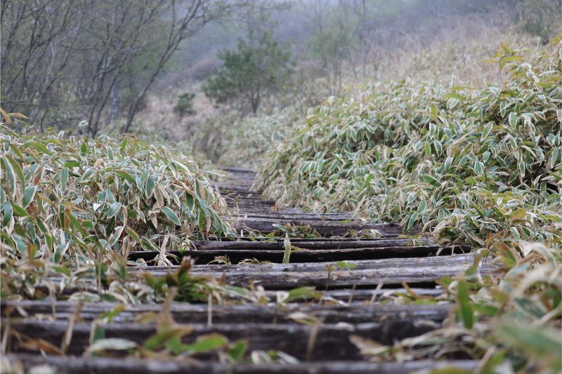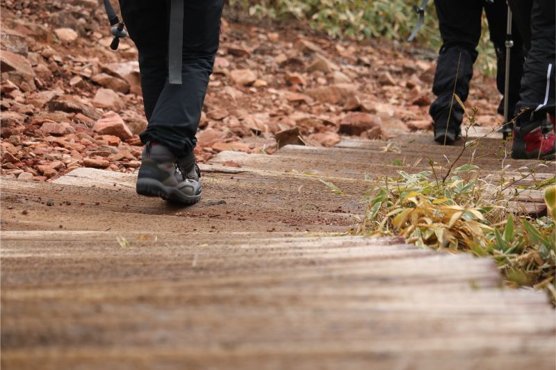 濡れている木道ではトレッキングポール先端に装着したゴムキャップが滑りやすくなってしまう場合もあるので、安全第一、臨機応変に状況に応じて対応する(ゴムキャップを外す)ことをおすすめします。