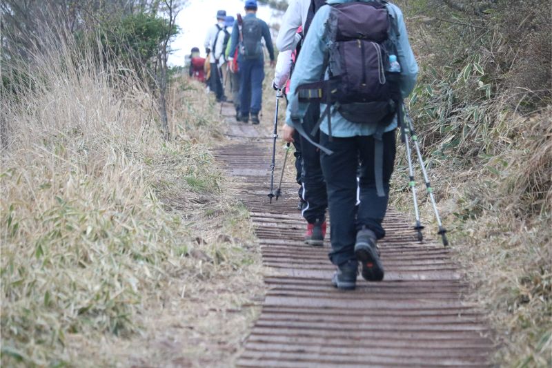 途中からは木の階段が続くのでポールの先端にはゴムキャップ(LEKIスリップレスラバーロング)を装着するか、先端を突き刺さずに添える程度に加減して、木道(木の階段)に配慮する心掛けが大事となります。