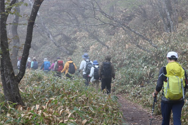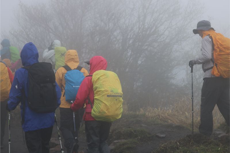 途中、さらに視界不良となるほどの濃霧の中、一行は鳥居峠を抜けて終着点のビジターセンターを目指します。