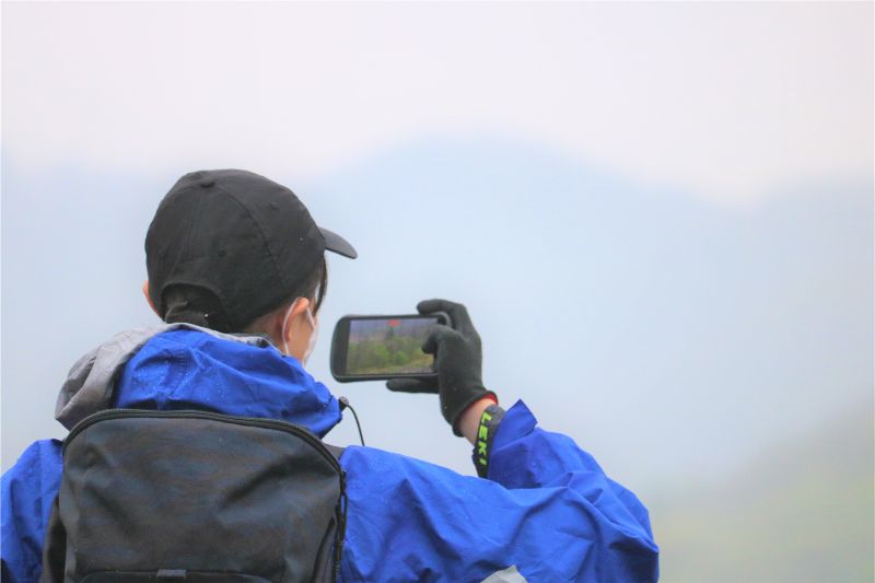 携帯で湿原の写真を撮って上手く撮れたか一緒に確認する仕草の一枚。