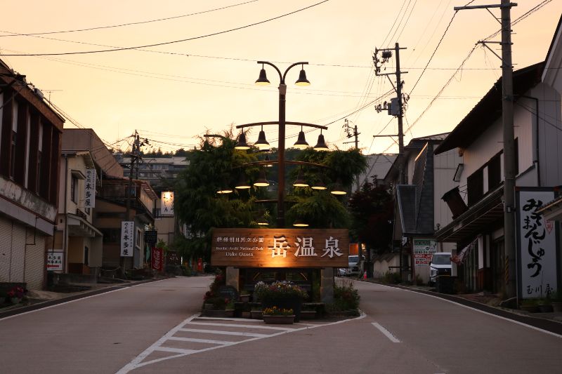 岳温泉街の入口にある看板が温泉街の雰囲気を醸し出していて、登山泊とは少し違った旅行気分を味わえます。