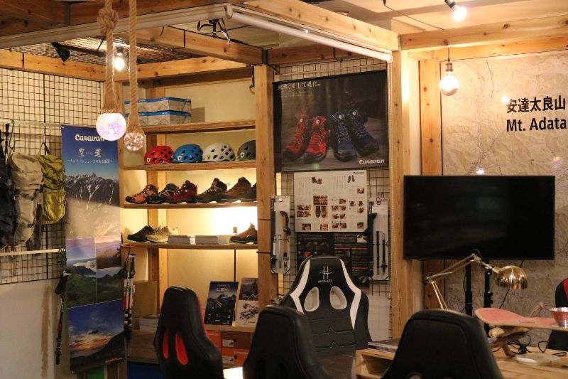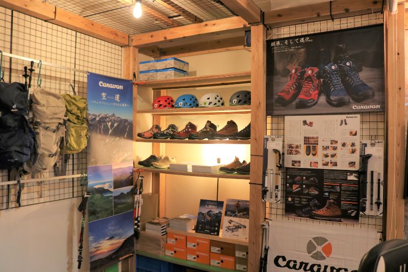 館内の一角に支配人のご厚意により、キャラバンシューズの展示スペースを設置中。