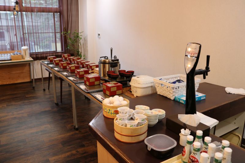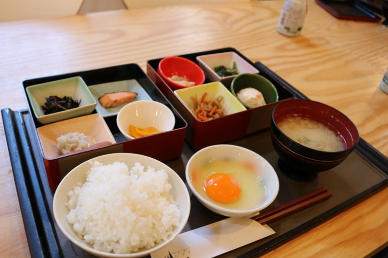 朝食会場では1人ずつ重箱ご膳が用意されていて、ご飯とお味噌汁をその場でよそってくれました。