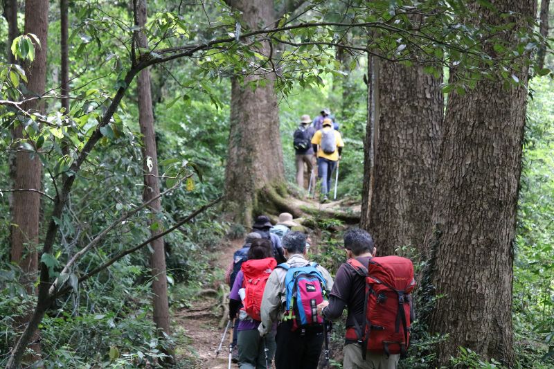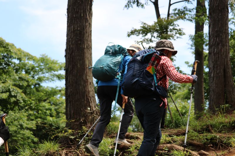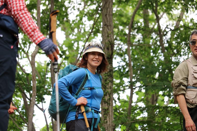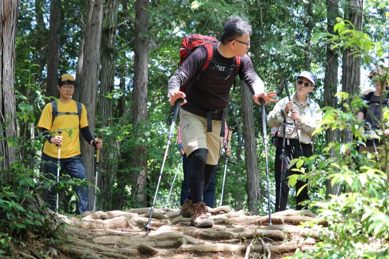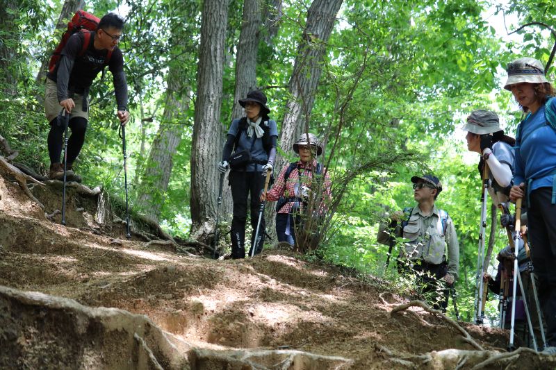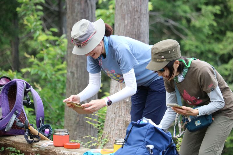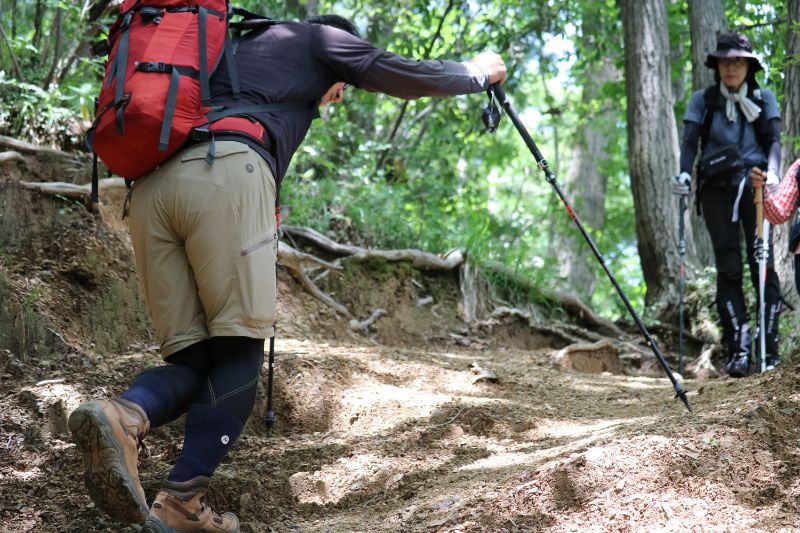 実際に登山道を移動しながらの講習なので、汗もかくし息も上がります。それでもガイド講師の方は休憩の間もなく下りながら解説、今度は折り返し登りながら解説と相当体力を使うだろうなと、企画した側としても大変恐縮しながら写真を撮らせてもらいました。あらためまして、ご協力ありがとうございます。