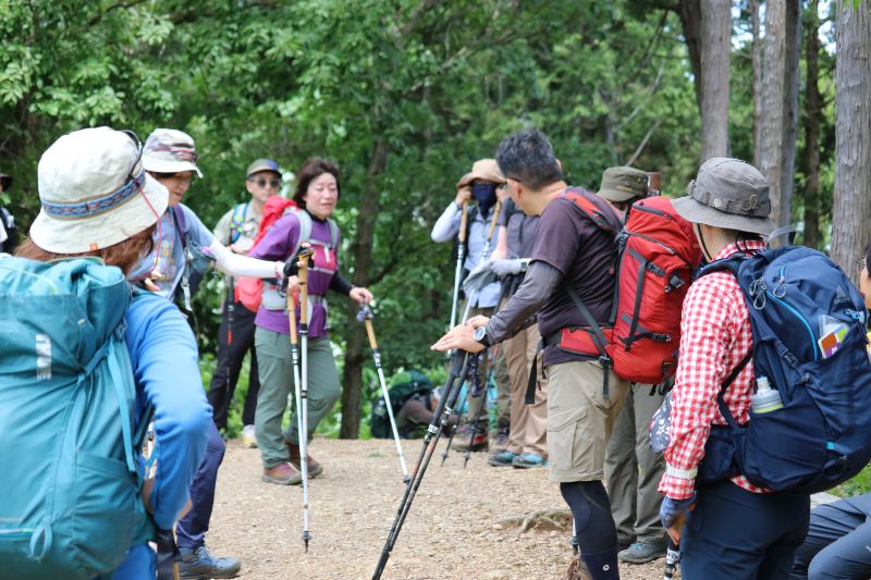 ガイドツアーの大半は、ガイド先導での山頂登頂が目的の山行となります。登山道を移動する際も一列になって、山頂を目指してとにかく歩きます。途中で草花の解説や小休止で豆知識を話してくれるガイドさんも多くいらっしゃいますが、今回のようにトレッキングポールに特化した講習会のためのガイドツアーを実施しているところは、おそらく他にはないのではないでしょうか。