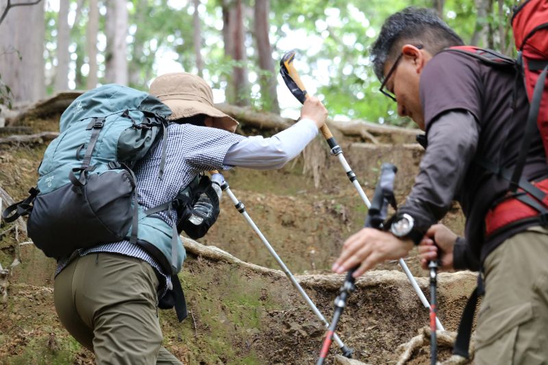 状況に応じたトレッキングポール・テクニックは、頭で理解するのと身体で動きを覚え込ませるのとではだいぶ違うようで、皆さん初めのうちは結構苦労している様子でした。